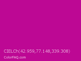 CIELCh 42.959,77.148,339.308 Color is a normal magenta color and the nearest color is Red Violet #c71585. Hex code #bd0894 and RGB value is rgb(189,8,148). In RGB color space, this color is composed of 74% red, 3% green, 58% blue, In CMYK color space, this color is composed of 0% cyan, 96% magenta, 22% yellow , 26% black , In HSL color space, this color has a hue angle of 314° , 92% saturation and 39% lightness.