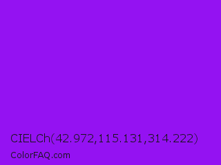 CIELCh 42.972,115.131,314.222 Color is a normal purple color and the nearest color is Veronica #a020f0. Hex code #9412f2 and RGB value is rgb(148,18,242). In RGB color space, this color is composed of 58% red, 7% green, 95% blue, In CMYK color space, this color is composed of 39% cyan, 93% magenta, 0% yellow , 5% black , In HSL color space, this color has a hue angle of 275° , 90% saturation and 51% lightness.