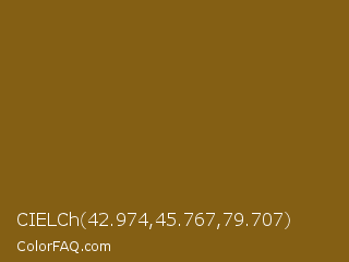 CIELCh 42.974,45.767,79.707 Color is a dark orange color and the nearest color is Grizzly #885818. Hex code #845f14 and RGB value is rgb(132,95,20). In RGB color space, this color is composed of 52% red, 37% green, 8% blue, In CMYK color space, this color is composed of 0% cyan, 28% magenta, 85% yellow , 48% black , In HSL color space, this color has a hue angle of 40° , 74% saturation and 30% lightness.