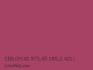 CIELCh 42.975,45.185,2.421 Color is a normal rose color and the nearest color is Medium Ruby #aa4069. Hex code #a84264 and RGB value is rgb(168,66,100). In RGB color space, this color is composed of 66% red, 26% green, 39% blue, In CMYK color space, this color is composed of 0% cyan, 61% magenta, 40% yellow , 34% black , In HSL color space, this color has a hue angle of 340° , 44% saturation and 46% lightness.