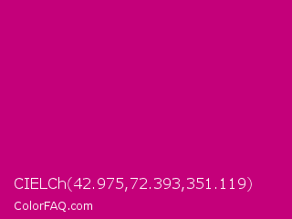 CIELCh 42.975,72.393,351.119 Color is a normal magenta color and the nearest color is Red Violet #c71585. Hex code #c4007a and RGB value is rgb(196,0,122). In RGB color space, this color is composed of 77% red, 0% green, 48% blue, In CMYK color space, this color is composed of 0% cyan, 100% magenta, 38% yellow , 23% black , In HSL color space, this color has a hue angle of 323° , 100% saturation and 38% lightness.