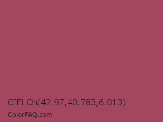 CIELCh 42.97,40.783,6.013 Color is a normal rose color and the nearest color is Hippie Pink #ae4560. Hex code #a34760 and RGB value is rgb(163,71,96). In RGB color space, this color is composed of 64% red, 28% green, 38% blue, In CMYK color space, this color is composed of 0% cyan, 56% magenta, 41% yellow , 36% black , In HSL color space, this color has a hue angle of 344° , 39% saturation and 46% lightness.