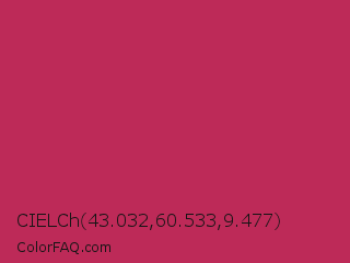 CIELCh 43.032,60.533,9.477 Color is a normal rose color and the nearest color is Dingy Dungeon #c53151. Hex code #bd2a58 and RGB value is rgb(189,42,88). In RGB color space, this color is composed of 74% red, 16% green, 35% blue, In CMYK color space, this color is composed of 0% cyan, 78% magenta, 53% yellow , 26% black , In HSL color space, this color has a hue angle of 341° , 64% saturation and 45% lightness.