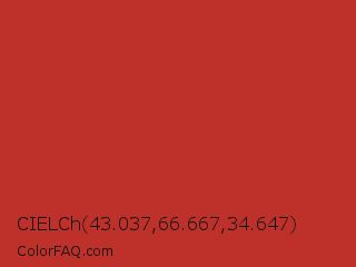 CIELCh 43.037,66.667,34.647 Color is a normal red color and the nearest color is International Orange Golden Gate Bridge #c0362c. Hex code #bd312a and RGB value is rgb(189,49,42). In RGB color space, this color is composed of 74% red, 19% green, 16% blue, In CMYK color space, this color is composed of 0% cyan, 74% magenta, 78% yellow , 26% black , In HSL color space, this color has a hue angle of 3° , 64% saturation and 45% lightness.
