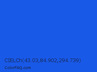 CIELCh 43.03,84.902,294.739 Color is a normal blue color and the nearest color is Palatinate Blue #273be2. Hex code #1959e8 and RGB value is rgb(25,89,232). In RGB color space, this color is composed of 10% red, 35% green, 91% blue, In CMYK color space, this color is composed of 89% cyan, 62% magenta, 0% yellow , 9% black , In HSL color space, this color has a hue angle of 221° , 82% saturation and 50% lightness.