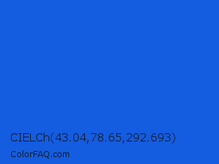 CIELCh 43.04,78.65,292.693 Color is a normal blue color and the nearest color is Bright Navy Blue #1974d2. Hex code #145ce0 and RGB value is rgb(20,92,224). In RGB color space, this color is composed of 8% red, 36% green, 88% blue, In CMYK color space, this color is composed of 91% cyan, 59% magenta, 0% yellow , 12% black , In HSL color space, this color has a hue angle of 219° , 84% saturation and 48% lightness.