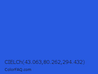 CIELCh 43.063,80.262,294.432 Color is a normal blue color and the nearest color is Mariner #286acd. Hex code #285ae1 and RGB value is rgb(40,90,225). In RGB color space, this color is composed of 16% red, 35% green, 88% blue, In CMYK color space, this color is composed of 82% cyan, 60% magenta, 0% yellow , 12% black , In HSL color space, this color has a hue angle of 224° , 76% saturation and 52% lightness.
