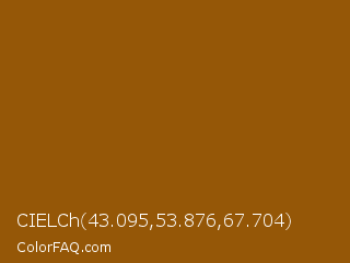 CIELCh 43.095,53.876,67.704 Color is a normal orange color and the nearest color is Chelsea Gem #9e5302. Hex code #955707 and RGB value is rgb(149,87,7). In RGB color space, this color is composed of 58% red, 34% green, 3% blue, In CMYK color space, this color is composed of 0% cyan, 42% magenta, 95% yellow , 42% black , In HSL color space, this color has a hue angle of 34° , 91% saturation and 31% lightness.
