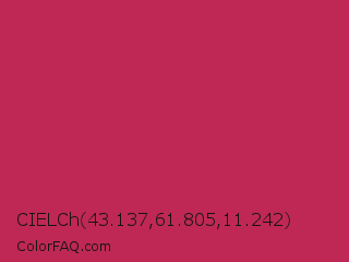 CIELCh 43.137,61.805,11.242 Color is a normal rose color and the nearest color is Rose Red #c21e56. Hex code #bf2855 and RGB value is rgb(191,40,85). In RGB color space, this color is composed of 75% red, 16% green, 33% blue, In CMYK color space, this color is composed of 0% cyan, 79% magenta, 55% yellow , 25% black , In HSL color space, this color has a hue angle of 342° , 65% saturation and 45% lightness.