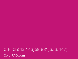 CIELCh 43.143,68.881,353.447 Color is a normal magenta color and the nearest color is Magenta Dye #ca1f7b. Hex code #c21475 and RGB value is rgb(194,20,117). In RGB color space, this color is composed of 76% red, 8% green, 46% blue, In CMYK color space, this color is composed of 0% cyan, 90% magenta, 40% yellow , 24% black , In HSL color space, this color has a hue angle of 327° , 81% saturation and 42% lightness.