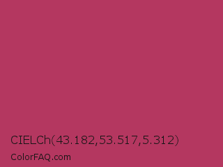 CIELCh 43.182,53.517,5.312 Color is a normal rose color and the nearest color is Rich Maroon #b03060. Hex code #b43760 and RGB value is rgb(180,55,96). In RGB color space, this color is composed of 71% red, 22% green, 38% blue, In CMYK color space, this color is composed of 0% cyan, 69% magenta, 47% yellow , 29% black , In HSL color space, this color has a hue angle of 340° , 53% saturation and 46% lightness.