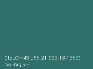 CIELCh 43.185,21.933,187.363 Color is a normal cyan color and the nearest color is Myrtle Green #317873. Hex code #31706a and RGB value is rgb(49,112,106). In RGB color space, this color is composed of 19% red, 44% green, 42% blue, In CMYK color space, this color is composed of 56% cyan, 0% magenta, 5% yellow , 56% black , In HSL color space, this color has a hue angle of 174° , 39% saturation and 32% lightness.
