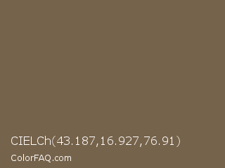 CIELCh 43.187,16.927,76.91 Color is a normal orange color and the nearest color is Roman Coffee #795d4c. Hex code #76634b and RGB value is rgb(118,99,75). In RGB color space, this color is composed of 46% red, 39% green, 29% blue, In CMYK color space, this color is composed of 0% cyan, 16% magenta, 36% yellow , 54% black , In HSL color space, this color has a hue angle of 33° , 22% saturation and 38% lightness.