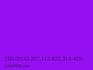 CIELCh 43.207,115.825,314.455 Color is a normal purple color and the nearest color is Veronica #a020f0. Hex code #960ff3 and RGB value is rgb(150,15,243). In RGB color space, this color is composed of 59% red, 6% green, 95% blue, In CMYK color space, this color is composed of 38% cyan, 94% magenta, 0% yellow , 5% black , In HSL color space, this color has a hue angle of 276° , 90% saturation and 51% lightness.