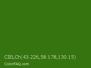 CIELCh 43.226,58.178,130.15 Color is a dark green color and the nearest color is Bilbao #327c14. Hex code #36740f and RGB value is rgb(54,116,15). In RGB color space, this color is composed of 21% red, 45% green, 6% blue, In CMYK color space, this color is composed of 53% cyan, 0% magenta, 87% yellow , 55% black , In HSL color space, this color has a hue angle of 97° , 77% saturation and 26% lightness.