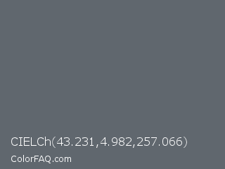 CIELCh 43.231,4.982,257.066 Color is a normal blue color and the nearest color is Shuttle Gray #5f6672. Hex code #60676e and RGB value is rgb(96,103,110). In RGB color space, this color is composed of 38% red, 40% green, 43% blue, In CMYK color space, this color is composed of 13% cyan, 6% magenta, 0% yellow , 57% black , In HSL color space, this color has a hue angle of 210° , 7% saturation and 40% lightness.