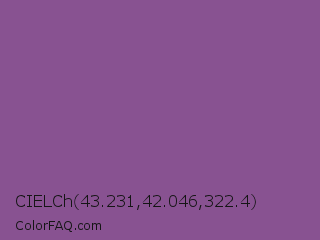 CIELCh 43.231,42.046,322.4 Color is a normal purple color and the nearest color is Razzmic Berry #8d4e85. Hex code #885291 and RGB value is rgb(136,82,145). In RGB color space, this color is composed of 53% red, 32% green, 57% blue, In CMYK color space, this color is composed of 6% cyan, 43% magenta, 0% yellow , 43% black , In HSL color space, this color has a hue angle of 291° , 28% saturation and 45% lightness.