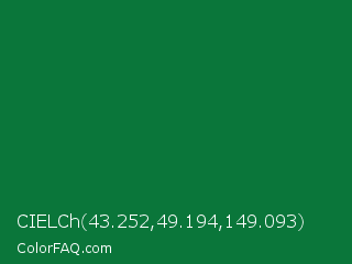 CIELCh 43.252,49.194,149.093 Color is a dark green color and the nearest color is La Salle Green #087830. Hex code #0a763a and RGB value is rgb(10,118,58). In RGB color space, this color is composed of 4% red, 46% green, 23% blue, In CMYK color space, this color is composed of 92% cyan, 0% magenta, 51% yellow , 54% black , In HSL color space, this color has a hue angle of 147° , 84% saturation and 25% lightness.