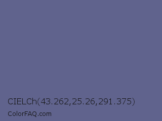 CIELCh 43.262,25.26,291.375 Color is a normal blue color and the nearest color is Dark Blue Gray #666699. Hex code #60638d and RGB value is rgb(96,99,141). In RGB color space, this color is composed of 38% red, 39% green, 55% blue, In CMYK color space, this color is composed of 32% cyan, 30% magenta, 0% yellow , 45% black , In HSL color space, this color has a hue angle of 236° , 19% saturation and 46% lightness.