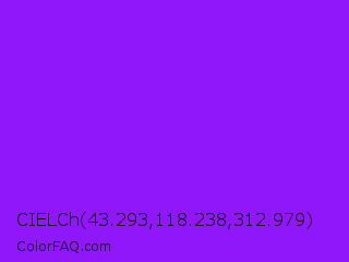CIELCh 43.293,118.238,312.979 Color is a normal purple color and the nearest color is Veronica #a020f0. Hex code #8f17fa and RGB value is rgb(143,23,250). In RGB color space, this color is composed of 56% red, 9% green, 98% blue, In CMYK color space, this color is composed of 43% cyan, 91% magenta, 0% yellow , 2% black , In HSL color space, this color has a hue angle of 272° , 96% saturation and 54% lightness.
