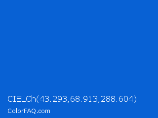 CIELCh 43.293,68.913,288.604 Color is a normal blue color and the nearest color is Science Blue #0066cc. Hex code #0861d4 and RGB value is rgb(8,97,212). In RGB color space, this color is composed of 3% red, 38% green, 83% blue, In CMYK color space, this color is composed of 96% cyan, 54% magenta, 0% yellow , 17% black , In HSL color space, this color has a hue angle of 214° , 93% saturation and 43% lightness.