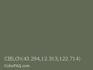 CIELCh 43.294,12.313,122.714 Color is a normal green color and the nearest color is Siam #646a54. Hex code #626955 and RGB value is rgb(98,105,85). In RGB color space, this color is composed of 38% red, 41% green, 33% blue, In CMYK color space, this color is composed of 7% cyan, 0% magenta, 19% yellow , 59% black , In HSL color space, this color has a hue angle of 81° , 11% saturation and 37% lightness.