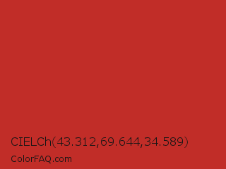 CIELCh 43.312,69.644,34.589 Color is a normal red color and the nearest color is International Orange Golden Gate Bridge #c0362c. Hex code #c12d28 and RGB value is rgb(193,45,40). In RGB color space, this color is composed of 76% red, 18% green, 16% blue, In CMYK color space, this color is composed of 0% cyan, 77% magenta, 79% yellow , 24% black , In HSL color space, this color has a hue angle of 2° , 66% saturation and 46% lightness.