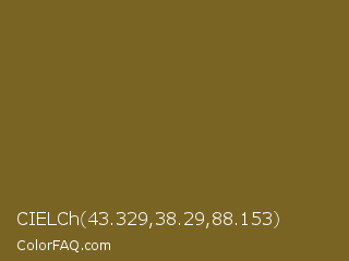 CIELCh 43.329,38.29,88.153 Color is a normal orange color and the nearest color is Kumera #886221. Hex code #7a6424 and RGB value is rgb(122,100,36). In RGB color space, this color is composed of 48% red, 39% green, 14% blue, In CMYK color space, this color is composed of 0% cyan, 18% magenta, 70% yellow , 52% black , In HSL color space, this color has a hue angle of 45° , 54% saturation and 31% lightness.