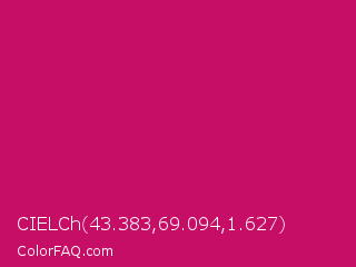 CIELCh 43.383,69.094,1.627 Color is a normal rose color and the nearest color is Dogwood Rose #d71868. Hex code #c70e66 and RGB value is rgb(199,14,102). In RGB color space, this color is composed of 78% red, 5% green, 40% blue, In CMYK color space, this color is composed of 0% cyan, 93% magenta, 49% yellow , 22% black , In HSL color space, this color has a hue angle of 331° , 87% saturation and 42% lightness.