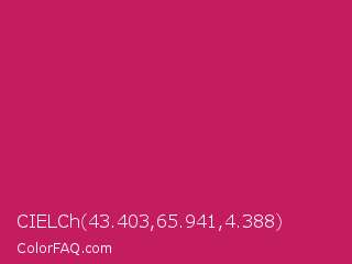 CIELCh 43.403,65.941,4.388 Color is a normal rose color and the nearest color is Rose Red #c21e56. Hex code #c41c61 and RGB value is rgb(196,28,97). In RGB color space, this color is composed of 77% red, 11% green, 38% blue, In CMYK color space, this color is composed of 0% cyan, 86% magenta, 51% yellow , 23% black , In HSL color space, this color has a hue angle of 335° , 75% saturation and 44% lightness.