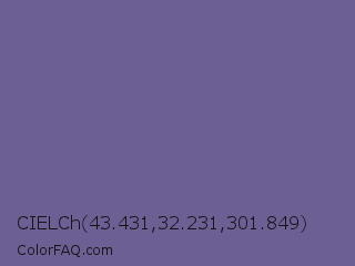 CIELCh 43.431,32.231,301.849 Color is a normal indigo color and the nearest color is Dark Blue Gray #666699. Hex code #6b5f94 and RGB value is rgb(107,95,148). In RGB color space, this color is composed of 42% red, 37% green, 58% blue, In CMYK color space, this color is composed of 28% cyan, 36% magenta, 0% yellow , 42% black , In HSL color space, this color has a hue angle of 254° , 22% saturation and 48% lightness.
