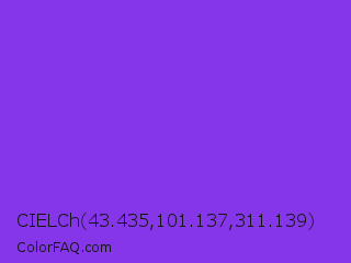 CIELCh 43.435,101.137,311.139 Color is a normal violet color and the nearest color is Blue Violet #8a2be2. Hex code #8536e8 and RGB value is rgb(133,54,232). In RGB color space, this color is composed of 52% red, 21% green, 91% blue, In CMYK color space, this color is composed of 43% cyan, 77% magenta, 0% yellow , 9% black , In HSL color space, this color has a hue angle of 267° , 79% saturation and 56% lightness.