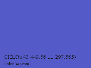 CIELCh 43.449,66.11,297.565 Color is a normal blue color and the nearest color is Iris #5a4fcf. Hex code #555ac9 and RGB value is rgb(85,90,201). In RGB color space, this color is composed of 33% red, 35% green, 79% blue, In CMYK color space, this color is composed of 58% cyan, 55% magenta, 0% yellow , 21% black , In HSL color space, this color has a hue angle of 237° , 52% saturation and 56% lightness.