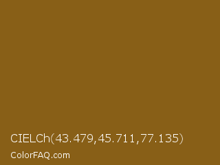 CIELCh 43.479,45.711,77.135 Color is a normal orange color and the nearest color is Grizzly #885818. Hex code #885f17 and RGB value is rgb(136,95,23). In RGB color space, this color is composed of 53% red, 37% green, 9% blue, In CMYK color space, this color is composed of 0% cyan, 30% magenta, 83% yellow , 47% black , In HSL color space, this color has a hue angle of 38° , 71% saturation and 31% lightness.