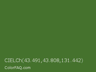 CIELCh 43.491,43.808,131.442 Color is a normal green color and the nearest color is Sap Green #507d2a. Hex code #45722d and RGB value is rgb(69,114,45). In RGB color space, this color is composed of 27% red, 45% green, 18% blue, In CMYK color space, this color is composed of 39% cyan, 0% magenta, 61% yellow , 55% black , In HSL color space, this color has a hue angle of 99° , 43% saturation and 31% lightness.