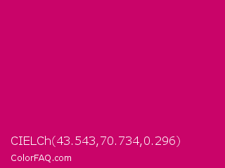 CIELCh 43.543,70.734,0.296 Color is a normal rose color and the nearest color is Rubine Red #d10056. Hex code #c90469 and RGB value is rgb(201,4,105). In RGB color space, this color is composed of 79% red, 2% green, 41% blue, In CMYK color space, this color is composed of 0% cyan, 98% magenta, 48% yellow , 21% black , In HSL color space, this color has a hue angle of 329° , 96% saturation and 40% lightness.