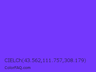 CIELCh 43.562,111.757,308.179 Color is a normal indigo color and the nearest color is Blue Violet #8a2be2. Hex code #7437fd and RGB value is rgb(116,55,253). In RGB color space, this color is composed of 45% red, 22% green, 99% blue, In CMYK color space, this color is composed of 54% cyan, 78% magenta, 0% yellow , 1% black , In HSL color space, this color has a hue angle of 258° , 98% saturation and 60% lightness.