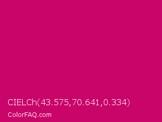 CIELCh 43.575,70.641,0.334 Color is a normal rose color and the nearest color is Rubine Red #d10056. Hex code #c90569 and RGB value is rgb(201,5,105). In RGB color space, this color is composed of 79% red, 2% green, 41% blue, In CMYK color space, this color is composed of 0% cyan, 98% magenta, 48% yellow , 21% black , In HSL color space, this color has a hue angle of 329° , 95% saturation and 40% lightness.