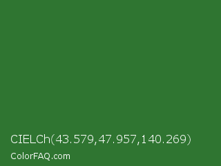 CIELCh 43.579,47.957,140.269 Color is a normal green color and the nearest color is Mughal Green #306030. Hex code #2f7531 and RGB value is rgb(47,117,49). In RGB color space, this color is composed of 18% red, 46% green, 19% blue, In CMYK color space, this color is composed of 60% cyan, 0% magenta, 58% yellow , 54% black , In HSL color space, this color has a hue angle of 122° , 43% saturation and 32% lightness.