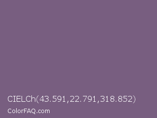 CIELCh 43.591,22.791,318.852 Color is a normal purple color and the nearest color is Old Lavender #796878. Hex code #785e80 and RGB value is rgb(120,94,128). In RGB color space, this color is composed of 47% red, 37% green, 50% blue, In CMYK color space, this color is composed of 6% cyan, 27% magenta, 0% yellow , 50% black , In HSL color space, this color has a hue angle of 286° , 15% saturation and 44% lightness.