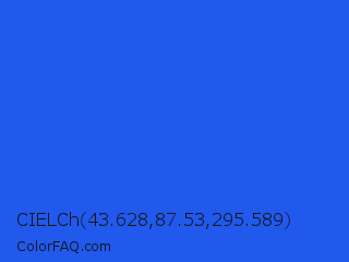 CIELCh 43.628,87.53,295.589 Color is a normal blue color and the nearest color is Palatinate Blue #273be2. Hex code #2159ed and RGB value is rgb(33,89,237). In RGB color space, this color is composed of 13% red, 35% green, 93% blue, In CMYK color space, this color is composed of 86% cyan, 62% magenta, 0% yellow , 7% black , In HSL color space, this color has a hue angle of 224° , 85% saturation and 53% lightness.