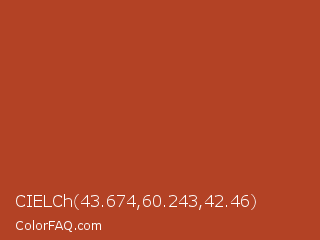 CIELCh 43.674,60.243,42.46 Color is a normal red color and the nearest color is Chinese Red #aa381e. Hex code #b34225 and RGB value is rgb(179,66,37). In RGB color space, this color is composed of 70% red, 26% green, 15% blue, In CMYK color space, this color is composed of 0% cyan, 63% magenta, 79% yellow , 30% black , In HSL color space, this color has a hue angle of 12° , 66% saturation and 42% lightness.