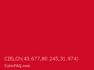CIELCh 43.677,80.245,31.974 Color is a normal red color and the nearest color is Lava #cf1020. Hex code #cf0a25 and RGB value is rgb(207,10,37). In RGB color space, this color is composed of 81% red, 4% green, 15% blue, In CMYK color space, this color is composed of 0% cyan, 95% magenta, 82% yellow , 19% black , In HSL color space, this color has a hue angle of 352° , 91% saturation and 43% lightness.