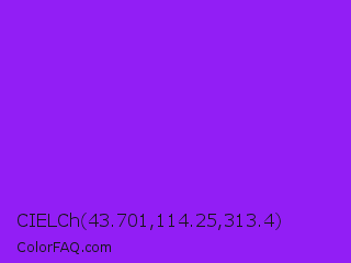 CIELCh 43.701,114.25,313.4 Color is a normal purple color and the nearest color is Veronica #a020f0. Hex code #921ef5 and RGB value is rgb(146,30,245). In RGB color space, this color is composed of 57% red, 12% green, 96% blue, In CMYK color space, this color is composed of 40% cyan, 88% magenta, 0% yellow , 4% black , In HSL color space, this color has a hue angle of 272° , 91% saturation and 54% lightness.