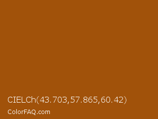 CIELCh 43.703,57.865,60.42 Color is a normal orange color and the nearest color is Rich Gold #a85307. Hex code #a1520a and RGB value is rgb(161,82,10). In RGB color space, this color is composed of 63% red, 32% green, 4% blue, In CMYK color space, this color is composed of 0% cyan, 49% magenta, 94% yellow , 37% black , In HSL color space, this color has a hue angle of 29° , 88% saturation and 34% lightness.