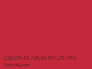 CIELCh 43.708,66.837,25.784 Color is a normal red color and the nearest color is Brick Red #c62d42. Hex code #c4293b and RGB value is rgb(196,41,59). In RGB color space, this color is composed of 77% red, 16% green, 23% blue, In CMYK color space, this color is composed of 0% cyan, 79% magenta, 70% yellow , 23% black , In HSL color space, this color has a hue angle of 353° , 65% saturation and 46% lightness.