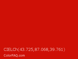 CIELCh 43.725,87.068,39.761 Color is a normal red color and the nearest color is Boston University Red #cc0000. Hex code #cf1006 and RGB value is rgb(207,16,6). In RGB color space, this color is composed of 81% red, 6% green, 2% blue, In CMYK color space, this color is composed of 0% cyan, 92% magenta, 97% yellow , 19% black , In HSL color space, this color has a hue angle of 3° , 94% saturation and 42% lightness.