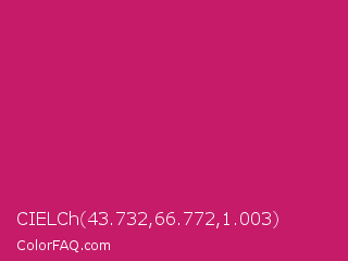 CIELCh 43.732,66.772,1.003 Color is a normal rose color and the nearest color is Dogwood Rose #d71868. Hex code #c51b68 and RGB value is rgb(197,27,104). In RGB color space, this color is composed of 77% red, 11% green, 41% blue, In CMYK color space, this color is composed of 0% cyan, 86% magenta, 47% yellow , 23% black , In HSL color space, this color has a hue angle of 333° , 76% saturation and 44% lightness.