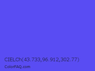 CIELCh 43.733,96.912,302.77 Color is a light indigo color and the nearest color is Majorelle Blue #6050dc. Hex code #584cf2 and RGB value is rgb(88,76,242). In RGB color space, this color is composed of 35% red, 30% green, 95% blue, In CMYK color space, this color is composed of 64% cyan, 69% magenta, 0% yellow , 5% black , In HSL color space, this color has a hue angle of 244° , 86% saturation and 62% lightness.