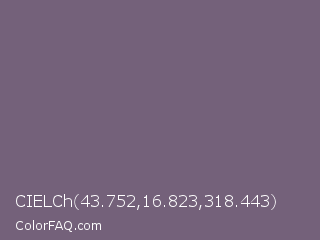 CIELCh 43.752,16.823,318.443 Color is a normal purple color and the nearest color is Old Lavender #796878. Hex code #74617a and RGB value is rgb(116,97,122). In RGB color space, this color is composed of 45% red, 38% green, 48% blue, In CMYK color space, this color is composed of 5% cyan, 20% magenta, 0% yellow , 52% black , In HSL color space, this color has a hue angle of 286° , 11% saturation and 43% lightness.